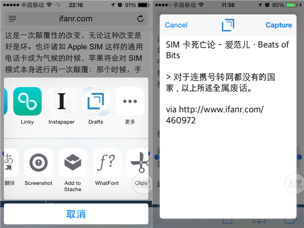 得益于 iOS 8 更加开放的 Share Extension 功能,Drafts 4 可以在 Safari 当前浏览的网页内直接抓取网页标题、URL 和已选择的某段文字,并以所设置好的模板来新建一个草稿,这个模板你也可以自定义排版,看你喜欢。