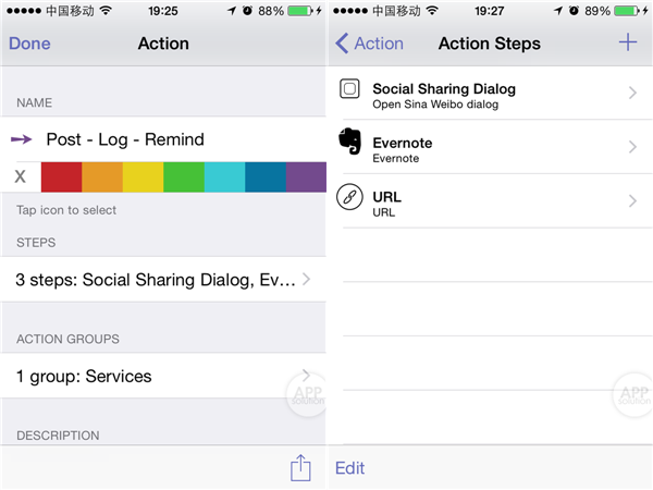 该 Action 就可分为三个步骤依次来执行。分享——记录——提醒——返回。但需要注意的是前提你已经设置好微博账号和绑定好印象笔记账号,否则该 Action 会无法执行。另外你可以改变每个步骤的执行顺序,但是如果其中有一个执行的步骤是 Open a URL 需要离开 Drafts 的,那么必须要排在最后才能保证其他步骤的顺利执行。