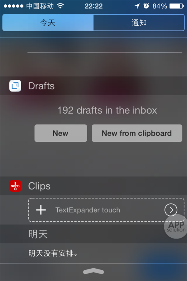 专为 iOS 8 设计的 Drafts 4 当然少不了对通知中心 Today Widget 的支持。你可以在通知中心快速新建一个新的草稿,或者直接选择将剪贴板的内容新建为一个草稿。另外还会显示目前收件箱中有多少草稿以提醒你是否需要处理。