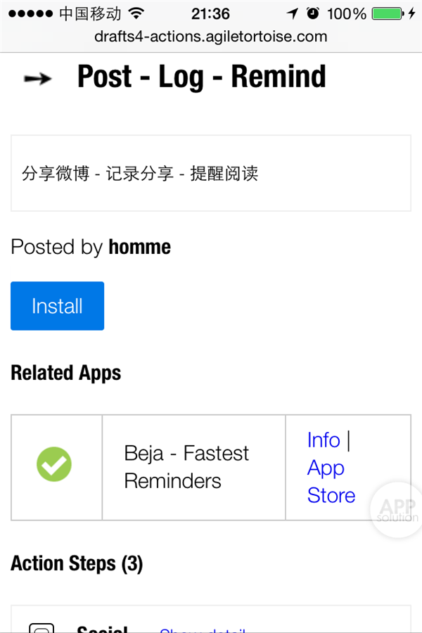 感兴趣的同学可以点击链接安装我发布在 Drafts Action Directory 上的 Action 来尝试一下。Action 界面居然还会自动显示相关 app 的介绍,值得一赞。