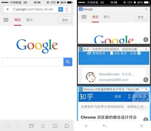 Mercury 在进行页面浏览的时候布局简单合理,并且会自动隐藏所有功能界面,整个屏幕呈现出来的都是页面内容。并且带有页面预览的标签栏也非常直观,让你能够随时进行切换。