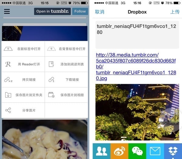 除了以上那些细节上非常打动人的体验,Mercury 也有非常强大的页面截取及分享功能。遇到某张好看的图片,除了保存到相册和通过各种社交网络进行分享,绑定 Dropbox 后还可以直接上传到云端进行多终端同步,方便极了。