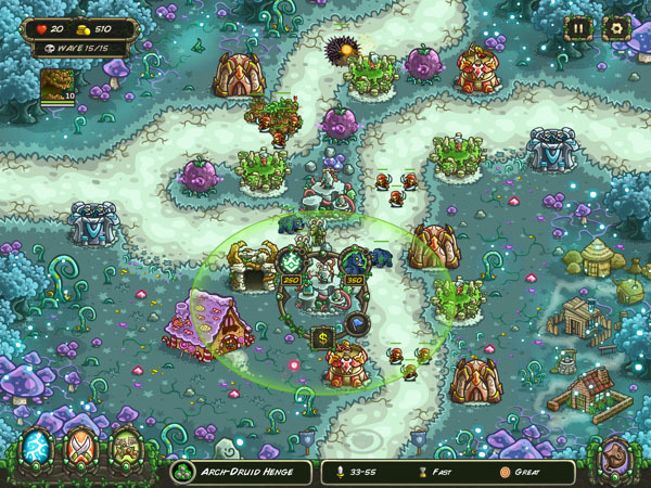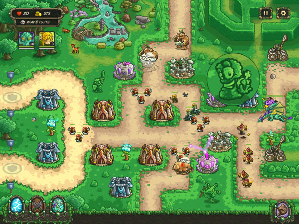 KRO 延续了前两代的经典操作,通过前几关的教学,玩家可以熟悉游戏操作。通过建造兵营、弓箭塔、魔法塔和巨石塔来抵御敌人的进攻。基础的四种建筑可以使用天赋技能点不断强化,最后还可以选择升级为两种特殊的防御塔,并拥有不同的技能。更多的选择和搭配,极大的丰富了游戏的可玩性。