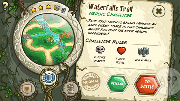 同时,Kingdom Rush 拥有三种挑战模式:Campaign, Heroic Challenge, Iron Challenge。游戏难度也分为三个等级,根据游戏习惯进行选择,资深玩家自然进阶高难等级,初入门的朋友也能轻松学会游戏操作。当然就算你是怎样的游戏大神,选择 Normal 也不会就轻松通关。三星体系让我们紧绷神经,阻止任何一个敌人进入我们的领土。