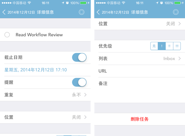 GoodTask 提供的 URL Scheme 非常丰富,除了支持简单的打开各种视图和列表以外,还支持添加新任务。添加新任务不只是单单支持添加任务标题而已,还可以同时设置好列表名称、过期时间、提醒、优先级、备注等,只要是任务信息里有的设置基本都可以通过 URL Scheme 来完成。另外 GoodTask 还支持 x-callback-url 功能,即完成添加任务后可以自动返回自定义的软件中。