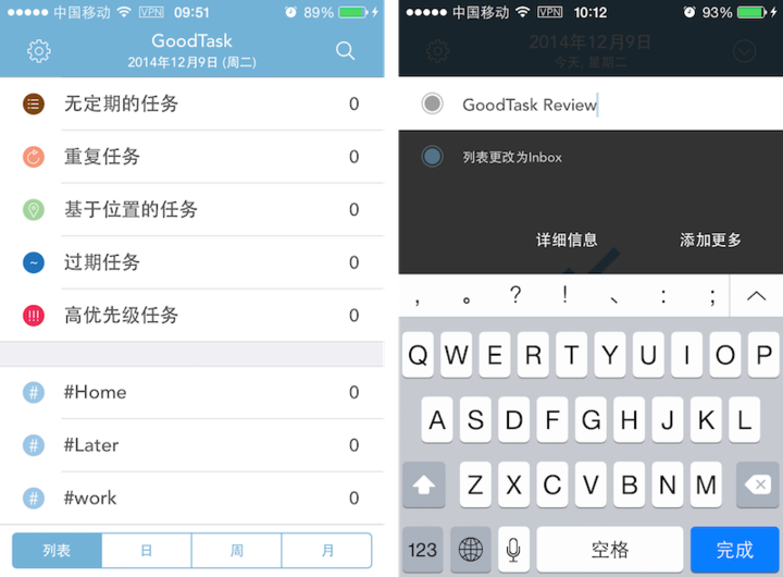 在列表栏里你可以查看到所有任务,以及各种任务的分类。如无定期任务、重复任务,基于位置的任务等。除此之外还可自定义添加各种标签的智能列表,如 #Home, #Later 等。