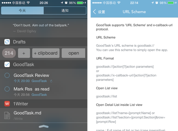 在 GoodTask 的设置中,开发者还为进阶用户提供了详细的 URL Scheme 使用文档。即使是初学者也可以很好地理解其使用格式。如果你是 Launch Center Pro 用户的话,可以直接查看到 GoodTask 的各项 URL Scheme 功能。