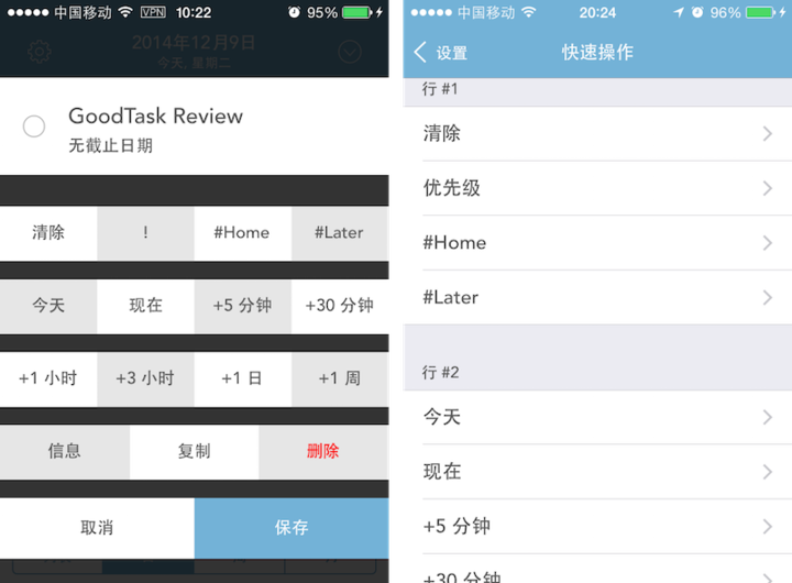 「快速操作」是 GoodTask 的另一个最棒的功能,长按任务即可呼出。这个操作可快速修改任务的优先级、任务标签以及提醒的时间。你可以快速延后或者提前半小时或者一小时,甚至一天一周都可以,更重要的是这些完全可以自定义!