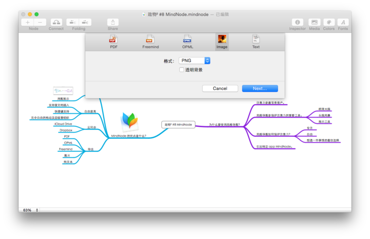 关于 MindNode 的导出功能,它支持将 MindNode 文件导出为 PDF、Freemind、OPML、图片和纯文本文件,可谓相当丰富。个人最常用到的还是导出为图片功能,这个功能在将导图分享给没有安装 MindNode 的人时非常实用。