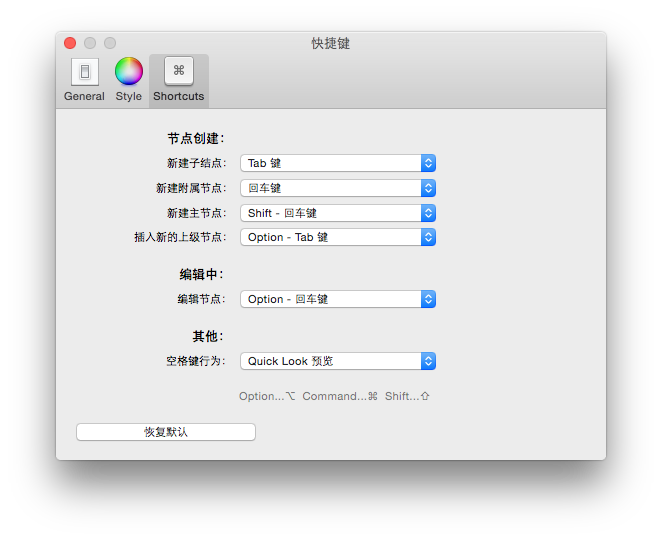 在默认设置下,按 Enter 键新建节点,按 Shift + Enter 新建主节点,按 Tab 键新建子节点,按 Option + Enter 键编辑节点,按 Space 键快速预览文件。所有快捷键均可自由更换,你还可以为「新建次级节点」设置快捷键。