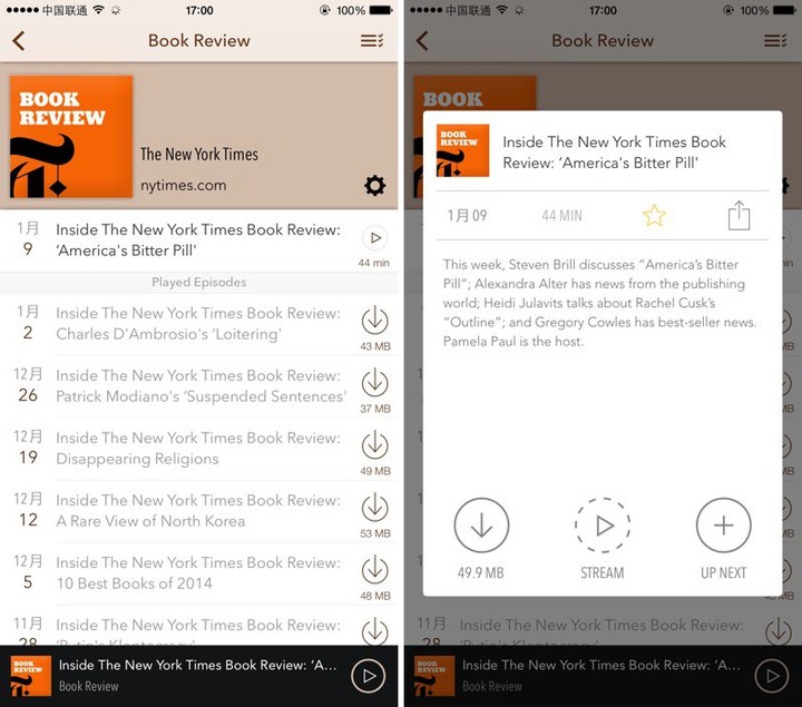 而关于推送和下载,只需描述一个场景你就懂了:写文章之前我突然想起早上收到了某订阅播客的更新,不过急着做其他的事就没搭理,然后写文章时候自然打开该条订阅,OK,最新的一条播客已经下载完成,下班回家直接插耳机就行了。