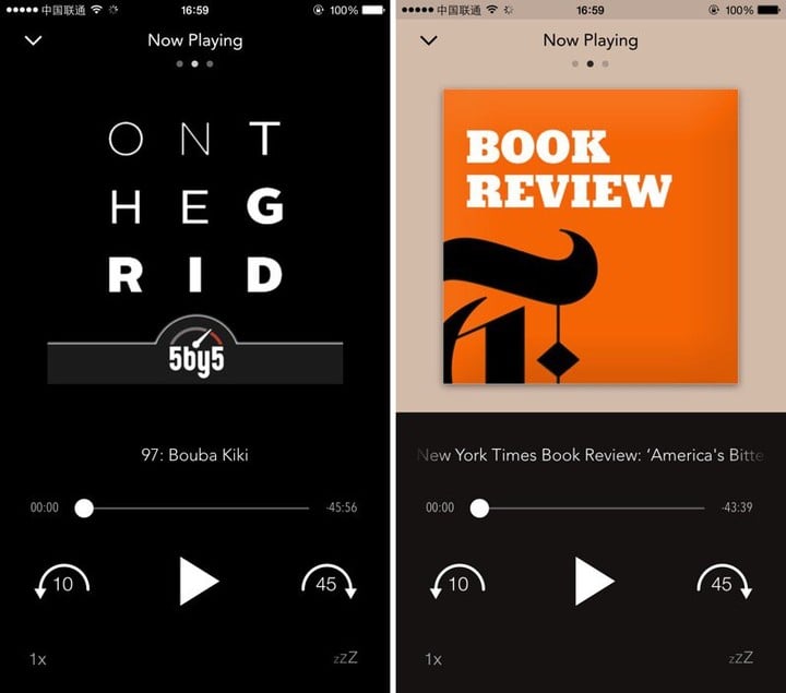 开启 Pocket Casts,它第一个让人感觉赏心悦目的地方,就是直接采用了色彩丰富的封面图进行排版,漂亮且直观。播放界面则采用了传统的播放器布局,只是将「上下曲」更换成了固定时长的时间点跳跃。