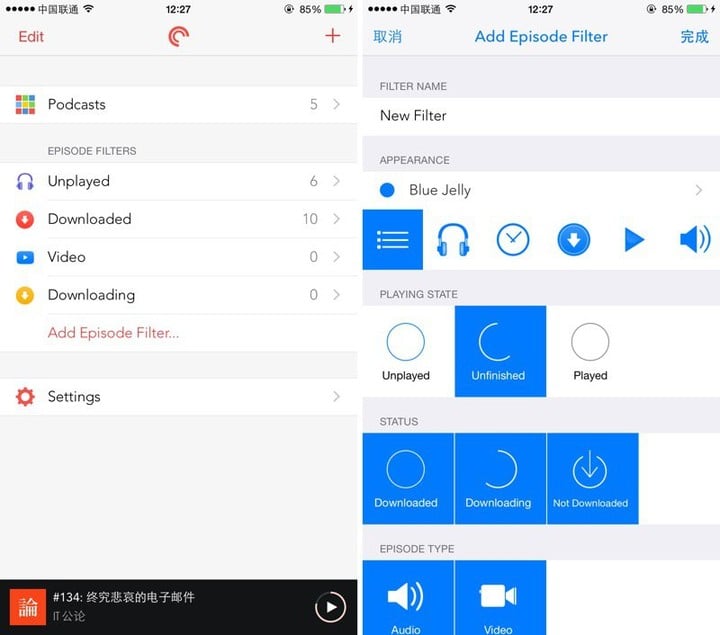 你可以使用不同的过滤条件(包括未开始,已完成,已下载,下载中,未下载,音频,视频等选项)来筛选自己出自己想要的播放列表,还可以更换各种图标以便于识别,这个功能在你订阅内容过多后相当实用。