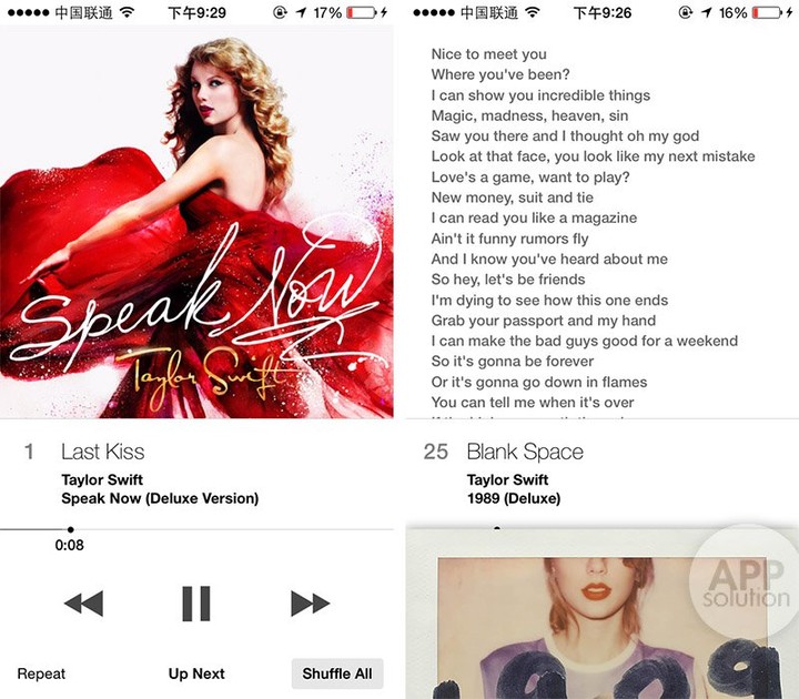 Cover Play 的播放列队可以被完全自定义。你可以把一首歌、一张专辑、一名演唱者的所有曲目、甚至某一种风格的歌曲添加到你的播放列队,并通过播放界面中的 Up Next 查看或编辑。显示歌词只需在播放界面中下拉封面,非常方便。
