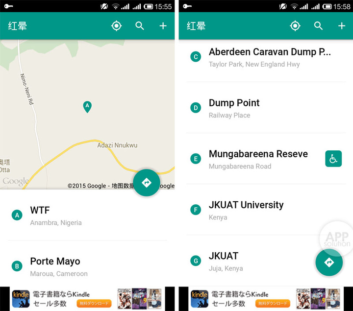 打开 Flush 即可快速定位你的地理位置并给出附近的卫生间信息,点击列表中的卫生间名,即可打开 Google 地图并导航至该卫生间,而点击地图旁的导航按钮,Flush 则会将你带到离你最近的 Toilet,随时随地,一键解决内急。
