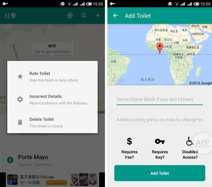 鉴于作者认为,内急人民一家亲,本着大家应该互帮互助,共同渡过难关的原则,Flush 支持用户添加卫生间或者反馈当前卫生间的错误信息。比如,你跟着 Flush 急匆匆地来到某免费卫生间门口,却被告知需要一把 Radar Key,愤怒之余,你将此信息反馈给 Flush 的数据库,免得让你的悲剧后继有人。