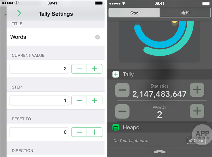 左划则可以进一步设置当前计数项的标题、当前数值、计数变量、默认值,以及选择是增量计数还是减量计数。当然你还可以开启 Today Widget 在通知中心直接计数。