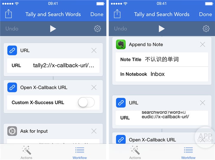 有了这个特性,我们还可以在 iOS Automation 上做文章。如在执行每次 Workflow 之前都使用 Tally 2 来计数,最后可以统计出哪个 Workflow 的使用次数是最多的(默认每次的 Workflow 都会顺利执行完毕)。除此之外,我们还可以在每次查阅单词之前都先用 Tally 2 来计数,最后统计出一共查阅了多少单词。在这里给大家分享一个做好的 Workflow ( https://workflow.is/workflows/4a57e9a932dc4249814daaf7e8694ad9 )。