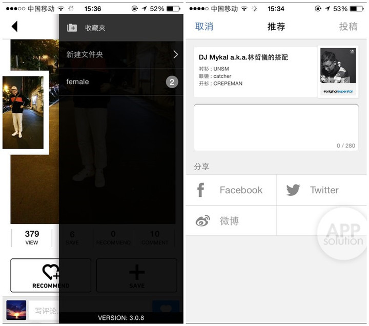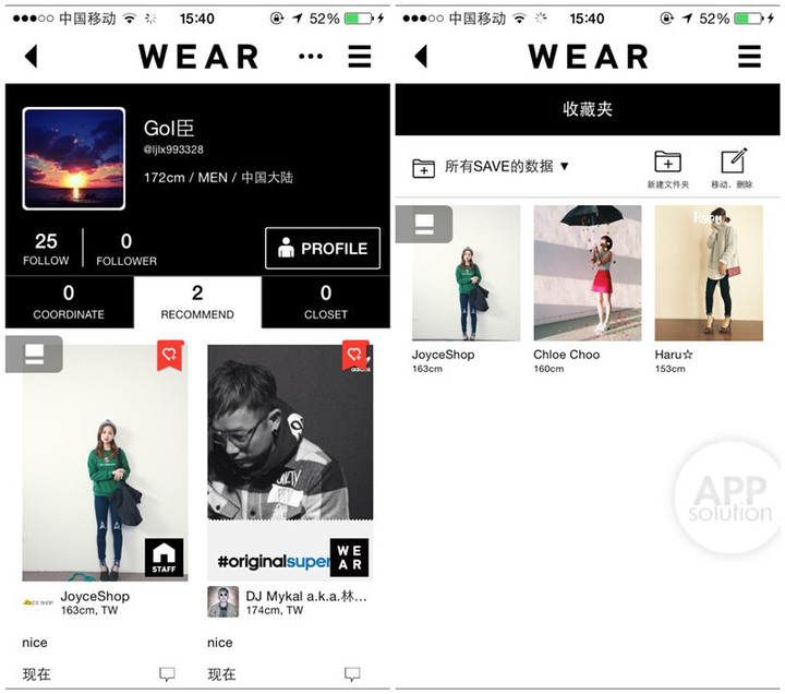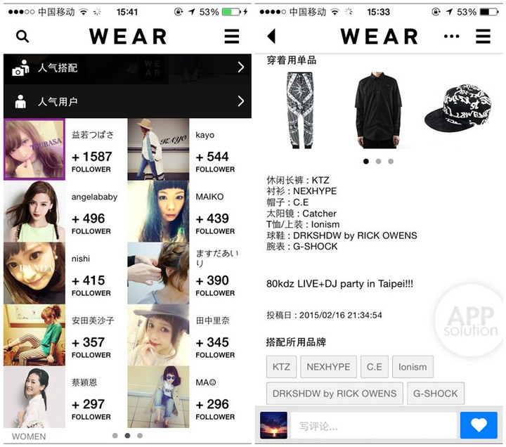 主页面显示人气比较高的整套服装的搭配推荐,往下是被其他用户推荐搭配较多的用户。WEAR 不仅仅有各地潮人的服装搭配推荐,而且还会有港台日韩的歌手明星的赞助品牌服饰推荐,这就免去了大家整天苦苦以图搜图去找名人的亲着款的麻烦。