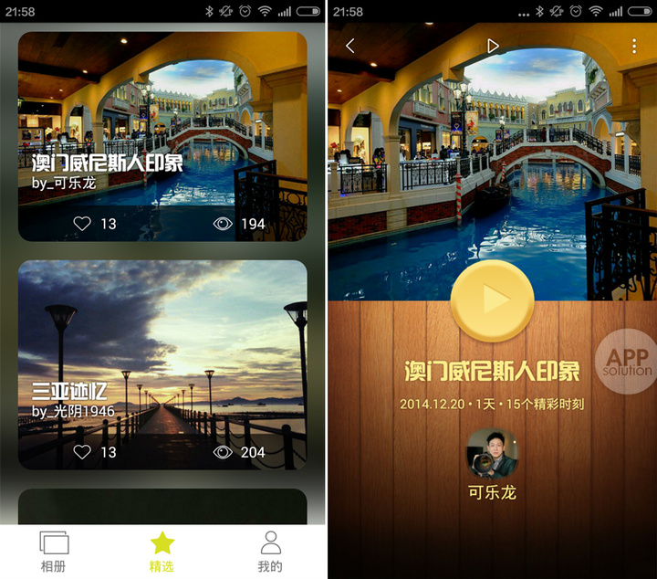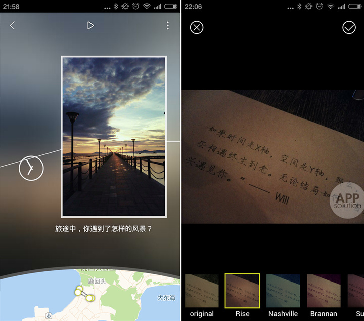 照片侧方,会用一个精致的时钟来显示拍摄时间,一个有趣的小细节是:若点击时钟,它会转动一圈,再次回到原来的时间;照片下方,若手机记录了拍照的地点,也会通过地图显示出来,给人一种还原旅途的感觉。