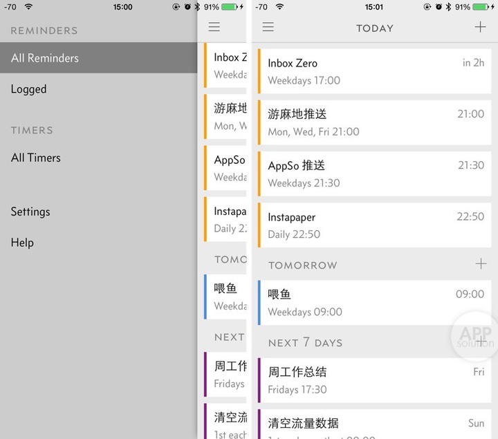 Due 2 在布局上选择了「侧边栏」,相比 Due 1 使用的「标签栏」更为简洁、功能更为聚焦,但在实际使用中它对操作效率(特别是对大屏手机而言)而言并不友好。想必作者也考虑到了这个效率问题,因此在导航栏上加入了左右滑动快速切换 Reminder 和 Timer 标签的操作来平衡。