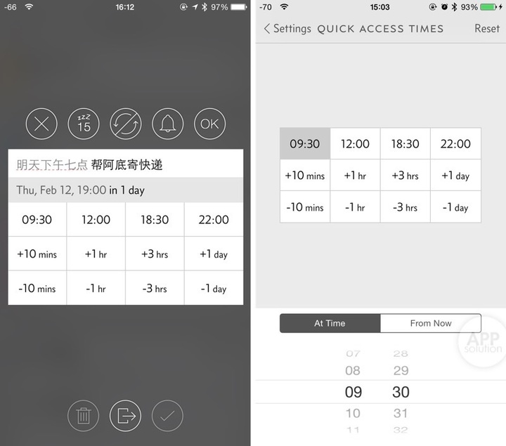 此外,作为一个在 iOS 8 时期诞生的应用,对新系统特性的支持自然也必不可少。目前它仅支持「可交互式通知」,你可以在通知条目上快速将事项推迟或者标记完成。