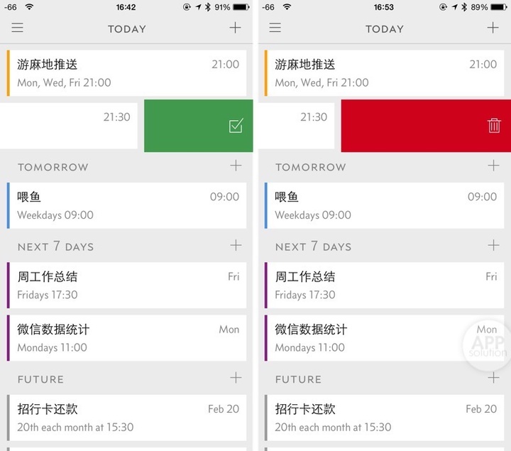 在展示方面,Due 2 将事件划分于 Today、Tomorrow、Next 7 Days 和 Future 四个区间下;通过短距离和长距离的左划手势可以将事项快速「标记完成」以及「删除」。