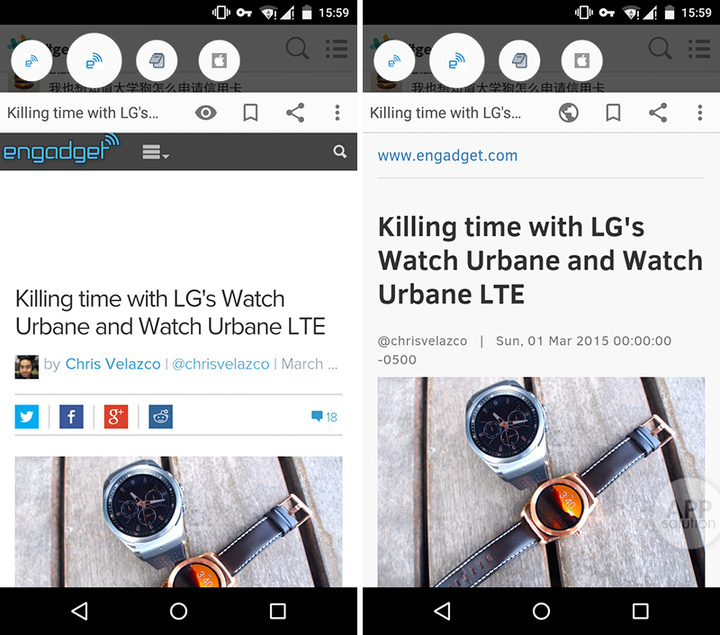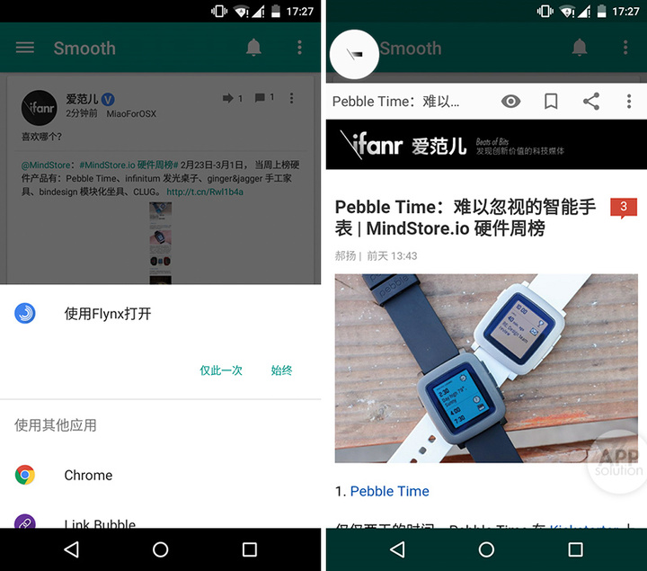 既然和 Link Bubble 定位一样,那么自然和 Link Bubble 在使用上大同小异。在浏览微博、Twitter 的时候,仅需点击链接,把跳转加载的事情交给 Flynx,继续刷刷刷。待到加载完毕,点开气泡。等待的时候,也有信息摄取。