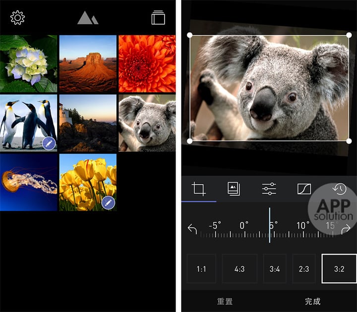 Darkroom 的界面十分简洁,黑色调的设计风格确实有几分暗房的意思。Darkroom 可以直接访问并调用整个图片库,避免了导入照片的繁琐。已经处理过的照片右下角会有标示,十分人性化。