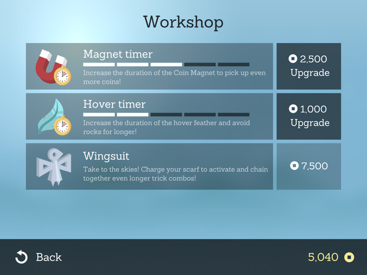 在每一次冒险中,总有三个目标待你完成,从简单到富有挑战。完成目标可以升级,解锁新的人物。如果你攒到了足够的金币,还可以去升级道具。Alto’s Adventure 没有内购,所以你不必担心广告和花钱来破坏这种宁静的感觉。
