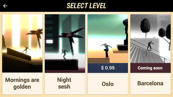目前,Skate Lines 有三个场景可选:免费的晨景和夜景,以及需要付费的 Oslo。晨景中金色笼罩着整个城市,如太阳初升;夜景则一片清幽,似月色朦胧。而且不同场景下的背景音乐也不尽相同,呈现出不同的视听享受。