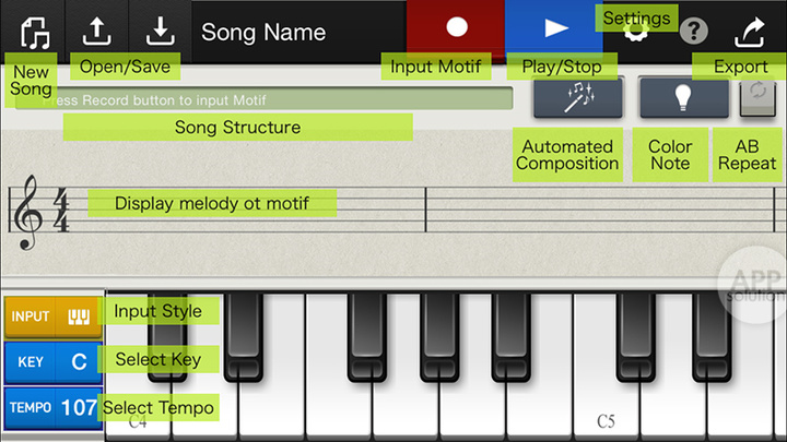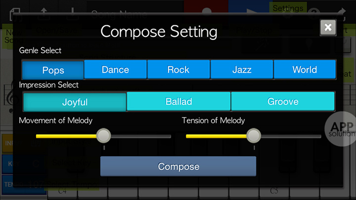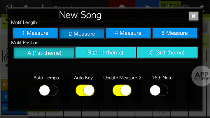左上角按钮可以设置新建歌曲的参数,其中比较重要的是输入旋律长度,默认的两小节可能稍短。设置停当之后点击红色按钮即可输入。