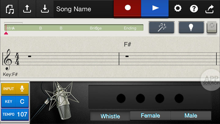 老实说应用的 UI 设计的并不精致,好在功能拔群。界面可以简单分为三块:最上面是控制按钮,中间是乐谱区,下方是输入区。点击 INPUT 可以在手写乐谱、键盘和录音三种输入方式之间切换。三种方式输入的难度依次降低,但同时精确度也会降低,并且也有调 key 调速的按钮。