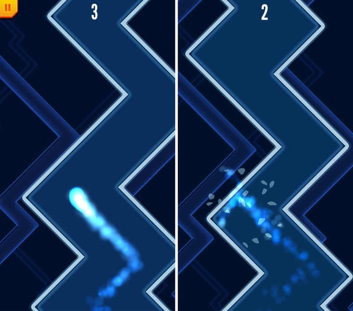 ZigZag Boom 那很有科技感的画面里的那束光就是你,你需要在急速前进的过程中点按屏幕来拐弯以免被撞。