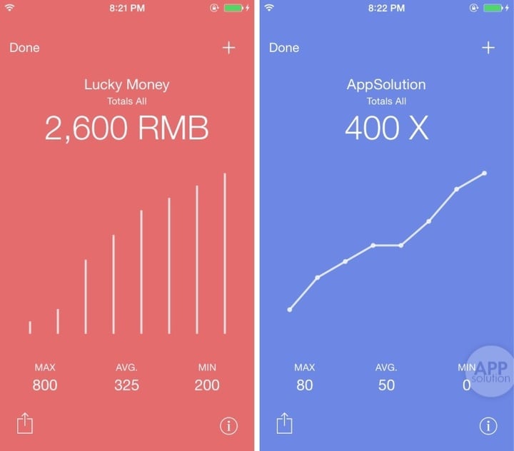 数据表格分为柱状图与折线图,1Number 会选取最近 10 项数据以图表呈现。卡片还会显示最值与平均值,总而言之,1Number 可以直观地追踪数据,观察走势。