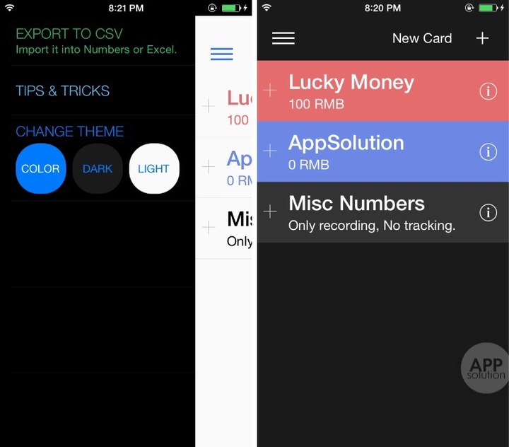 1Number 主界面简洁,有三款主题切换。新建卡片后,点击条目直接录入数据。