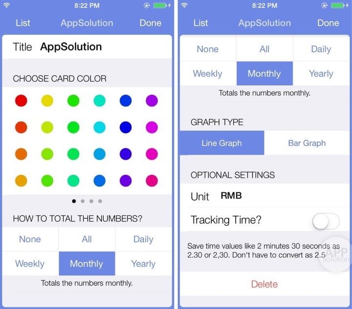 卡片设置方面相当丰富,除了多种颜色选择,用户还可自定义数据统计周期,例如每月收入统计,或者每周体重追踪。当然了,还有最重要的单位录入,开启「Tracking Time」选项,可以让时间记录更方便。