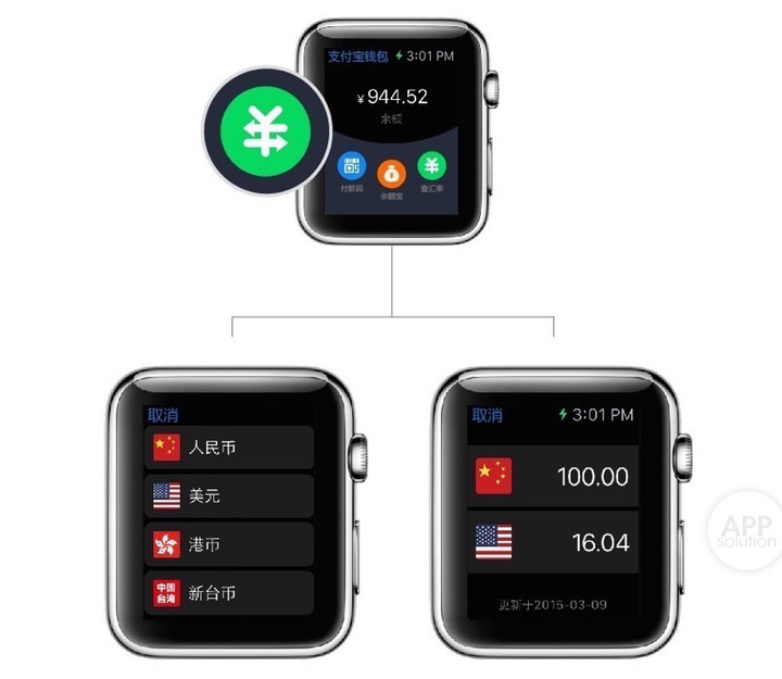 不仅如此,支付宝也在添加一些在 Apple Watch 我们可能会常用到的功能,例如查看汇率与余额宝收益,这些都可以通过 Apple Watch 做到。