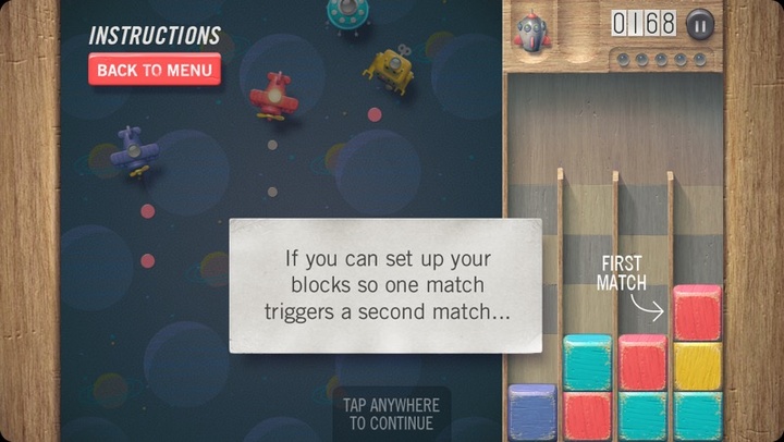 Toybox 通过左手移动飞船,右手滑动积木落入空槽进行游戏。游戏开始还显得小儿科,但过一会你就得手忙脚乱。玩家既要打击和躲避敌机,又得负责消除积木来提升火力。