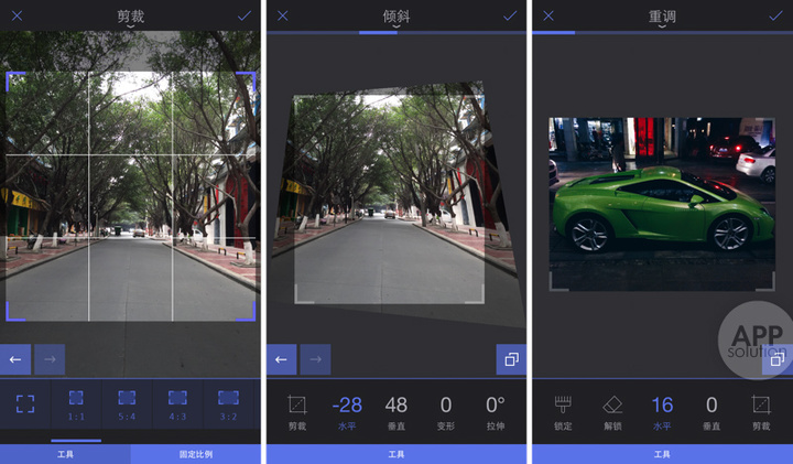 当我选择或拍摄好一张照片后,首先进入「画布」,也就是裁剪调整原片。Enlight 提供了三种工具,分别是「剪裁」、「倾斜」与「重调」。「裁剪」与大多数 app 类似;而「倾斜」则可以调整照片角度,类似之前 AppSo 推荐的 SKWRT;「重调」则很少见,不过很实用,你可以用画笔选定图片的某几个部分固定不变,然后在水平和垂直挤压照片,例如图中我将跑车首尾固定,挤压了中间部分,看起来缩短了不少,却显得自然。