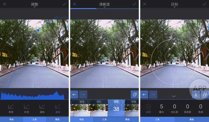 接下来是「图像」,相应有「调整」、「清晰度」与「目标」三个工具。「调整」与大多同类 app 相似,可以进行光影与颜色的调节,值得一提的是提供了颜色曲线,要知道这一功能可是要在 Darkroom 里内购的;「清晰度」提供了多种模板,当然你可以自己手动调节;「目标」则类似于 Snapseed 里的 Selective Adjust,以目标点为准调节曝光等参数,捏合调整半径和范围,轻扫以调节强度。