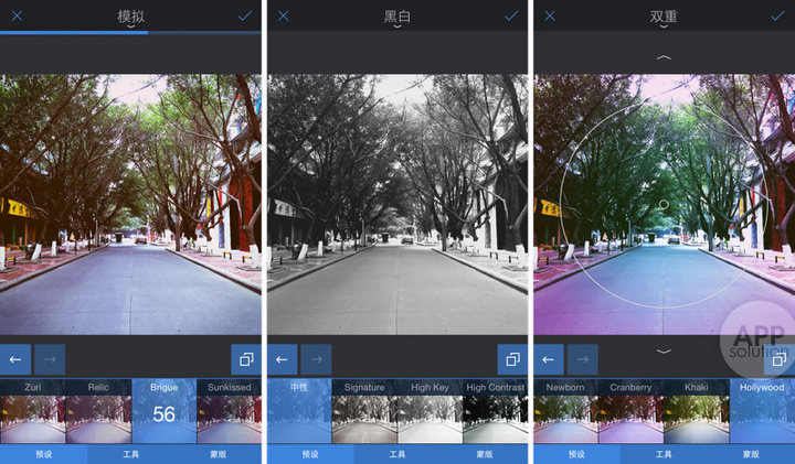 然后是就「滤镜」了,Enlight 的滤镜不算强大,和 VSCOCam 相比还有很大的差距,分为「模拟」、「黑白」和「双重」。我很喜欢「双重」滤镜,即为照片添加多形状双重渐变的效果,可以选择径向或者线性渐变,捏合及拖动调整,混色设置中还可调整透明度,甚至改变渐变颜色。