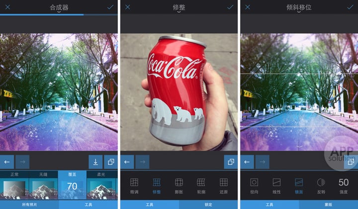 「工具」中你可以找到一些特殊的处理工具,例如「合成器」、「修整」以及「倾斜位移」。「合成器」可以使你将多张照片混合在一起,同样可以在混合设置你选择不同的方式;「修整」则可以将画面中的一个物体膨胀缩小、改变形状,非常神奇;「倾斜位移」也就是移轴,通过径向、线性以及镜面三种方式选择性模糊画面。