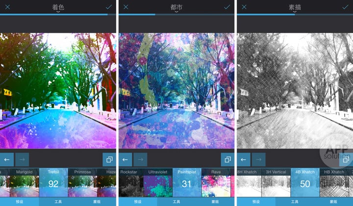 喜欢添加特效的你一定不能错过「艺术」这个工具。通过「着色」可以使你的照片看起来像是绘画作品;而「都市」则显得潮流与另类;「素描」效果也十分逼真。
