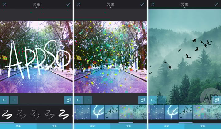 与之类似,在「画笔」中,我们可以添加「涂鸦」与「效果」,搭配不同画笔,发挥你的想象力,让照片变得好玩有趣。