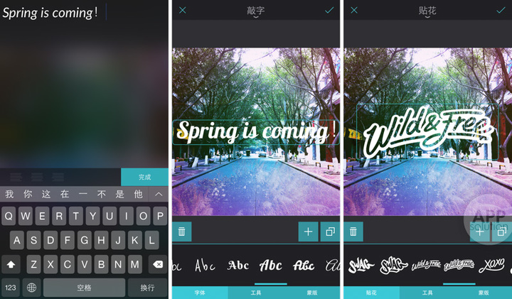 当然「文字」也是不可缺少的,你可以选择「敲字」、「贴花」以及「MEME」,虽然暂时只提供了英文字体的选择,但是在文字编辑里有丰富排版与样式,可以随心所欲的创作。