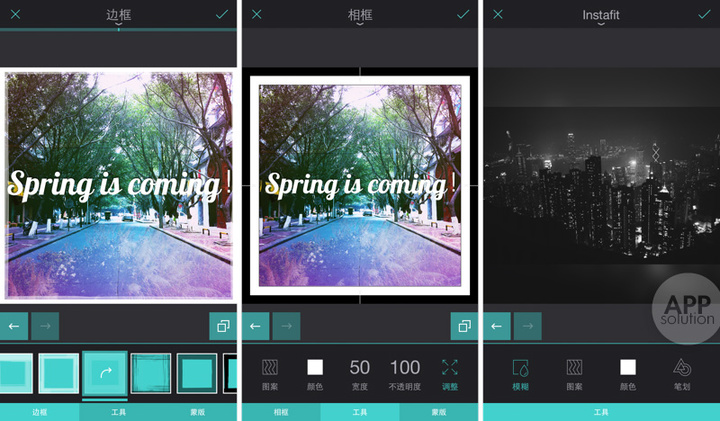 最后一步就是「定案」了,除了大家熟悉的「边框」和「相框」之外,Enlight 还提供了专门 Instagram 方格调整照片的 Instafit,特别是其中的模糊背景效果非常推荐。「拼贴」工具也很不错,可以调节比例、宽度以及圆角半径。