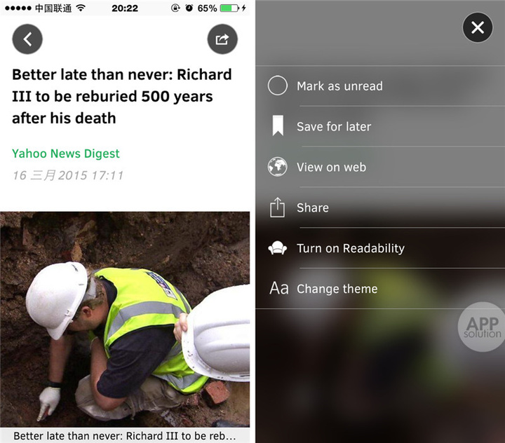 Neweer 的设置界面采用背景为灰色的毛玻璃设计,很有质感,这点比较符合战斗民族的形象。文章排版也是整齐划一,看起来赏心悦目,让人有阅读的愿望。如果没空阅读,你还可以把文章保存到保存到稍后阅读列表里。