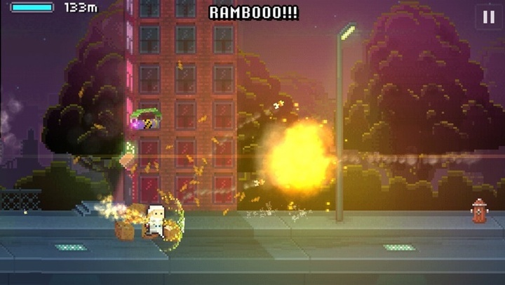 在这款跑酷游戏中,玩家只需专注跳跃和开火来避开各种机关,通过空降物资更换武器,能量槽充满时,主角还会无敌暴走。