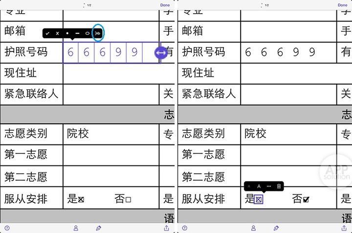 一般表格会有几个需要打钩的项目(如 □已婚 □未婚),这里就要祭出 Adobe Fill & Sign 的第一大技能了:点击小方格自动标记,有 √、X、● 等多种可选。点一下,打个勾,大小位置刚刚好,随手拯救强迫症。